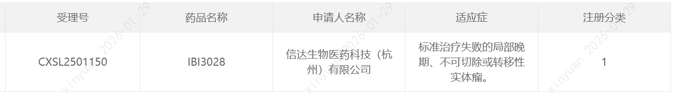 1月29日,中国国家药监局药品审评中心(CDE)官网公示,信达生物申报的1类新药IBI3028获批临床,拟开发用于标准治疗失败的局部晚期、不可切除或转移性实体瘤。根据信达生物公开资料,IBI3028为一款双抗双载荷ADC(抗体偶联药物)。