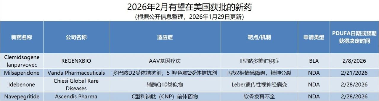 编者按:2025年,美国FDA旗下的药物评价和研究中心(CDER)批准了46款创新药。作为创新赋能者、客户信赖的合作伙伴以及全球医药及生命科学行业的贡献者,药明康德将持续通过独特的“CRDMO”业务模式,助力更多合作伙伴,为全球病患带来突破性创新疗法。根据PDUFA的目标日期,预计2026年2月,美国FDA将对4款创新药物是否获批做出监管决定,本文将对这些疗法进行相关介绍。