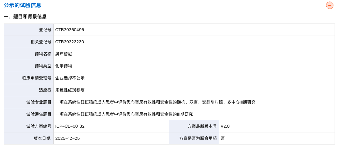 2 月 10 日,药物临床试验登记与信息公示平台官网显示,诺诚健华登记了一项在系统性红斑狼疮(SLE)成人患者中评价奥布替尼有效性和安全性的随机、双盲、安慰剂对照、多中心 III 期研究(登记号:CTR20260496)。