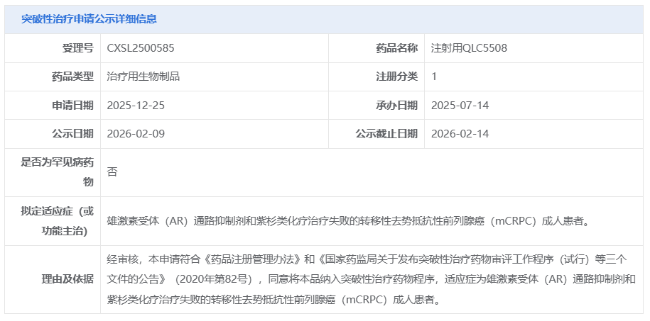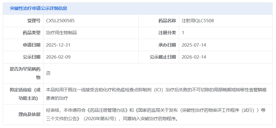 2025 年 11 月,QLC5508 用于经初始含铂治疗失败的复发性小细胞肺癌(SCLC)的申请已被 CDE 纳入突破性疗法品种。