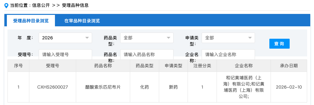 2 月 10 日,药监局官网显示,和黄医药醋酸索乐匹尼布片上市申请获受理,推测用于既往接受过一线标准治疗(糖皮质激素、免疫球蛋白)无效或复发的成人原发慢性免疫性血小板减少症(ITP)。此前该适应症已被纳入优先审评。