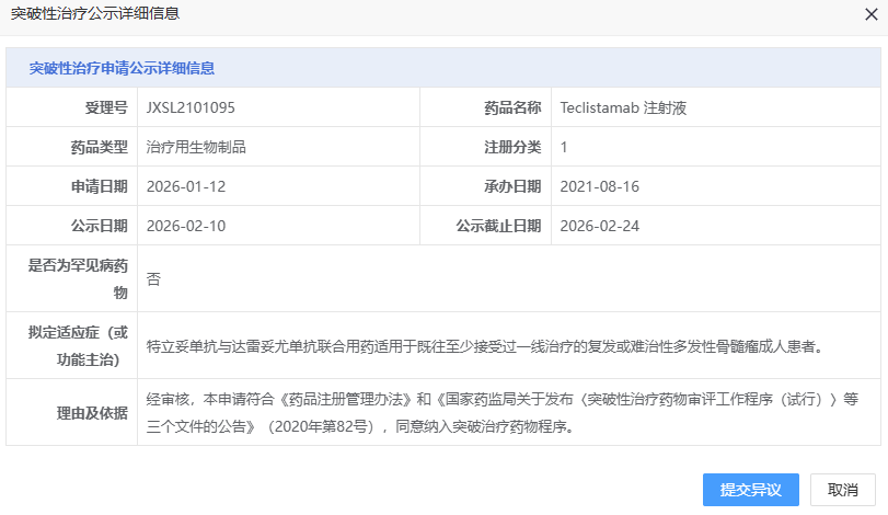 近日,CDE 官网显示,强生的 1 类新药 Teclistamab 注射液拟纳入突破性治疗品种,适应症为特立妥单抗与达雷妥尤单抗联合用药适用于既往至少接受过一线治疗的复发或难治性多发性骨髓瘤(R/R MM)成人患者。