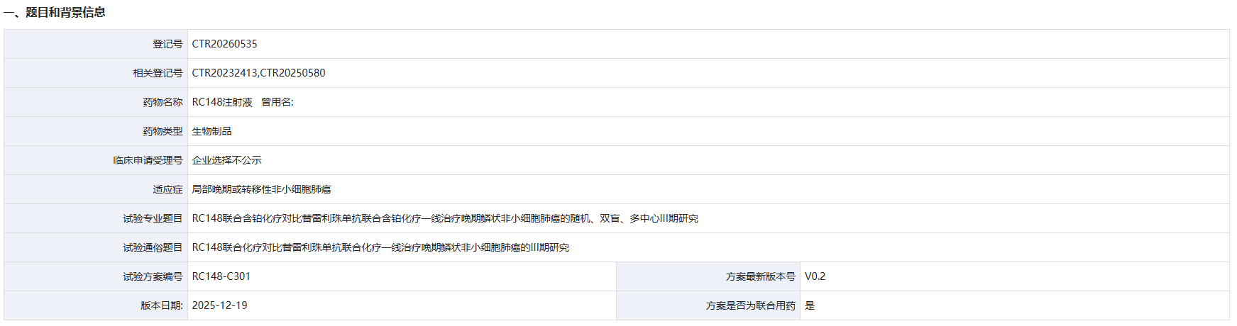 2 月 11 日,药物临床试验登记与信息公示平台官网显示,荣昌生物登记了一项 RC148 注射液治疗治疗晚期鳞状非小细胞肺癌的 III 期研究。根据公开信息,这是 RC148 启动的首个 III 期。