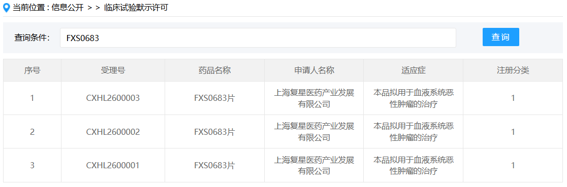 3 月 14 日,CDE 官网显示,复星医药 1 类新药 FXS0683 片获批临床,拟开发用于血液系统恶性肿瘤的治疗。
