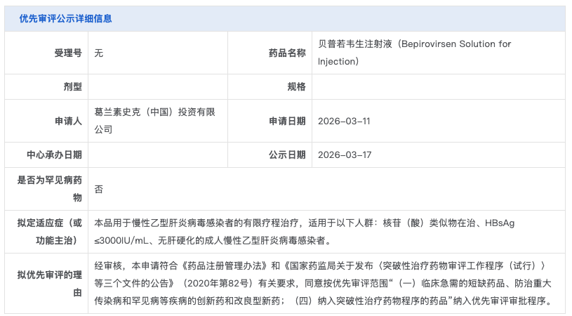 3 月 17日,CDE 官网显示,葛兰素史克(GSK)贝普若韦生注射液(Bepirovirsen Solution for Injection)拟纳入优先审评品种,用于慢性乙型肝炎病毒感染者的有限疗程治疗,适用于以下人群:核苷(酸)类似物在治、HBsAg≤3000IU/mL、无肝硬化的成人慢性乙型肝炎病毒感染者。此前该产品已在国内获得突破性疗法资格。