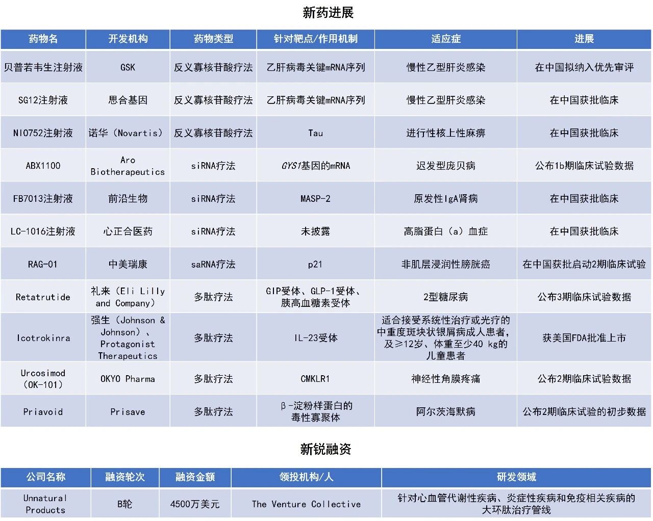 近期,全球多肽和寡核苷酸(TIDES)领域迎来系列进展。礼来(Eli Lilly and Company)三重激素受体激动剂retatrutide用于治疗2型糖尿病的3期临床试验达到主要终点和所有关键次要终点。治疗阿尔茨海默病(AD)的创新多肽疗法PRI-002取得了积极的2期临床试验安全性数据。强生(Johnson & Johnson)和Protagonist Therapeutics联合开发的口服多肽疗法icotrokinra获美国FDA批准上市,用于一线治疗中重度斑块状银屑病(PsO)。大环肽新锐Unnatural Products公司完成4500万美元融资。本文将节选其中部分重要进展做简单介绍,仅供读者参阅。