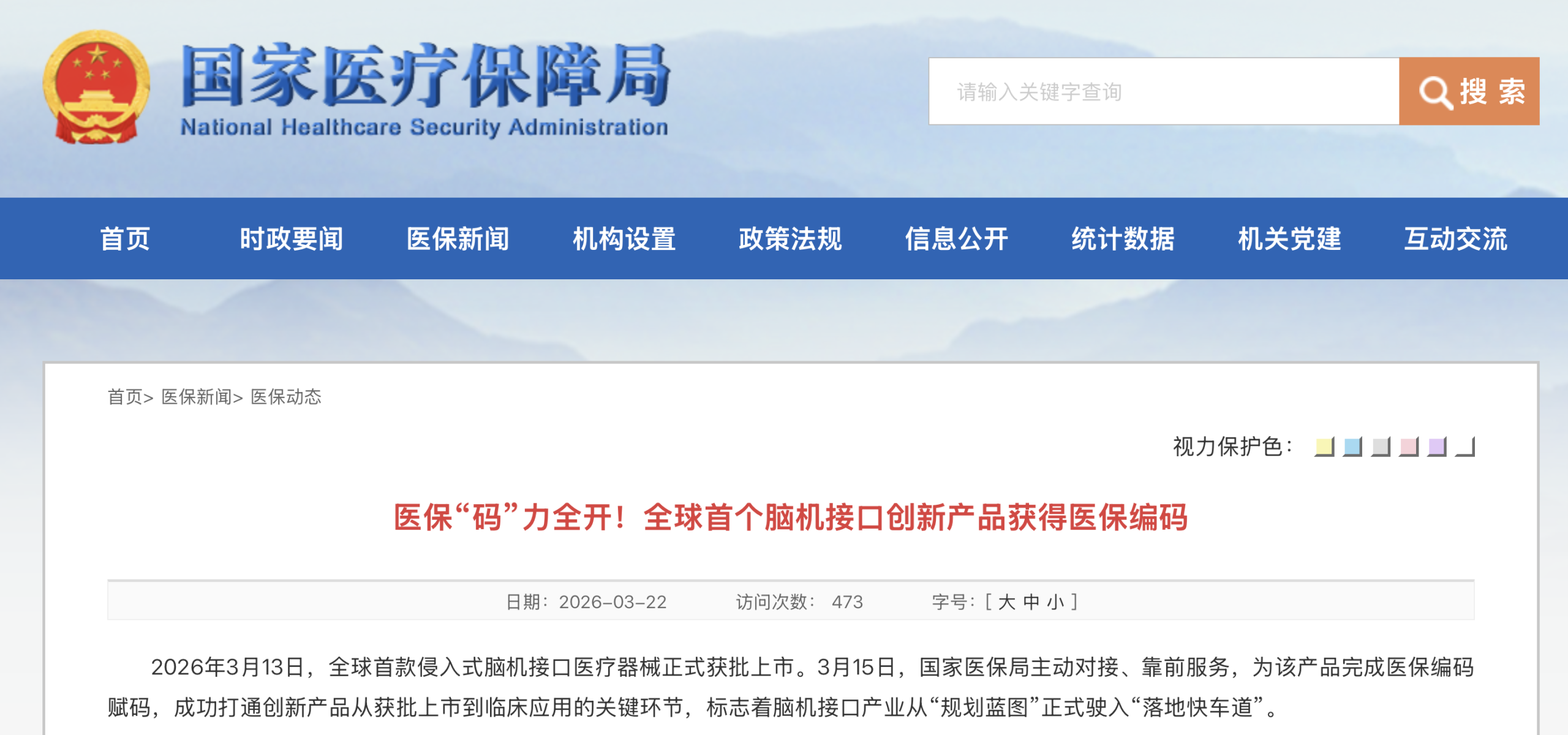 3月22日,国家医保局发布消息,全球首个脑机接口创新产品获得医保编码。