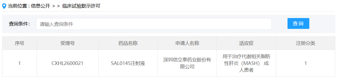 3 月 24 日,CDE 官网显示,信立泰的 1 类新药 SAL0145 注射液获批临床,拟开发用于治疗代谢相关脂肪性肝炎(MASH)成人患者。
