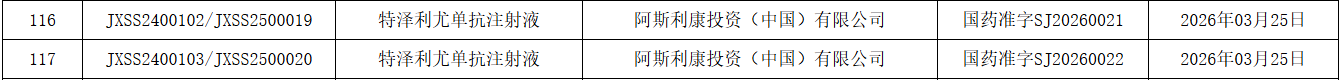 3 月 27 日,NMPA 官网显示,阿斯利康和安进联合递交的 TSLP 单抗特泽利尤单抗注射液获批上市。本次该药获批 2 个适应症,分别是哮喘(受理号:JXSS2400102/3)和慢性鼻窦炎伴鼻息肉病(受理号:JXSS2500019/20)。