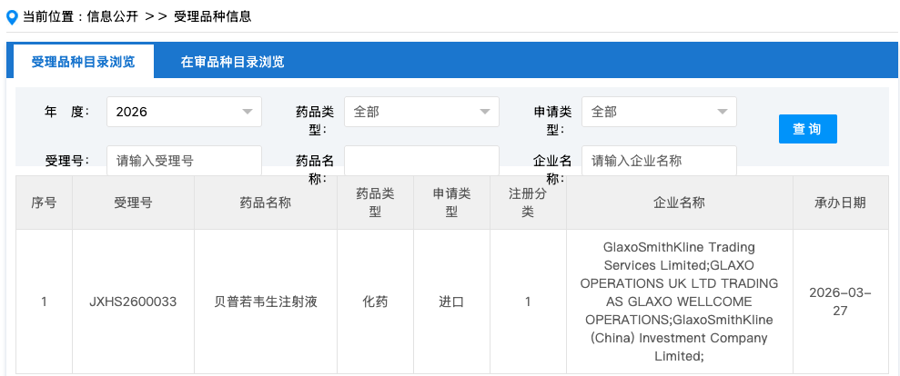 3 月 27 日,CDE 官网显示,GSK 的贝普若韦生注射液上市申请获受理,用于慢性乙型肝炎病毒感染者的有限疗程治疗,适用于以下人群:核苷(酸)类似物在治、HBsAg≤3000IU/mL、无肝硬化的成人慢性乙型肝炎病毒感染者。