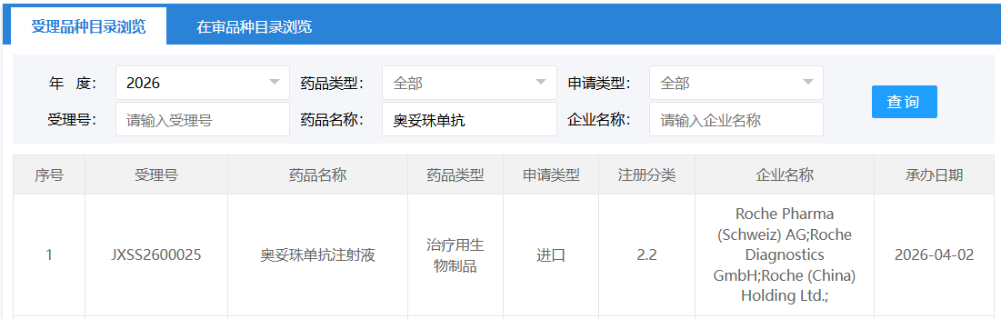 4 月 2 日,CDE 官网公示,罗氏奥妥珠单抗注射液的一项新适应症上市申请获得受理。根据该药的研究进度和注册分类,Insight 数据库推测本次申报的适应症为用于 2 岁及以上原发性肾病综合征患者的治疗。今年 2 月,该适应症已被 CDE 纳入优先审评。