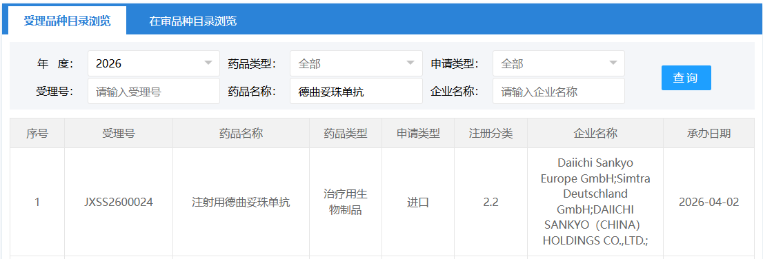4 月 2 日,CDE 官网公示,第一三共/阿斯利康的 HER2 ADC 德曲妥珠单抗一项新适应症上市申请获得受理。根据该药的研究进度和注册分类,Insight 数据库推测本次申报的适应症为用于接受抗 HER2 新辅助治疗后仍残存侵袭性病灶的 HER2 阳性成人乳腺癌,该适应症已被 CDE 纳入优先审评。