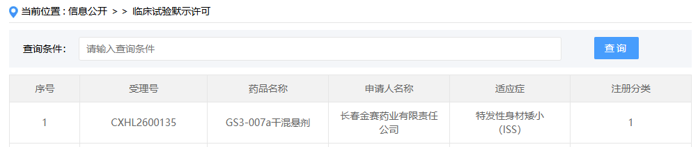 4 月 16 日,CDE 官网显示,金赛药业口服小分子生长激素促分泌药物 GS3-007a 干混悬剂新适应症获批临床,用于治疗儿童特发性身材矮小(ISS)。