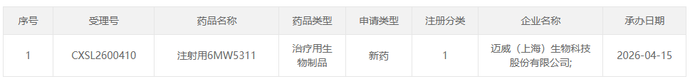 4 月 15 日,CDE 官网显示,迈威生物申报的 1 类新药 6MW5311 的临床试验申请获 CDE 受理,拟开发适应症为血液瘤(急性髓系白血病、慢性粒单核细胞白血病以及多发性骨髓瘤)。