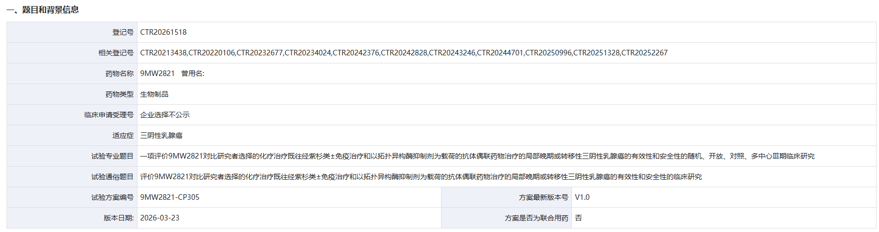 4 月 22 日,药物临床试验登记与信息公示平台官网显示,迈威生物登记了一项 9MW2821 治疗既往经紫杉类±免疫治疗和以拓扑异构酶抑制剂为载荷的抗体偶联药物(TOPi-ADC)治疗的局部晚期或转移性三阴性乳腺癌(TNBC)的 III 期临床研究。