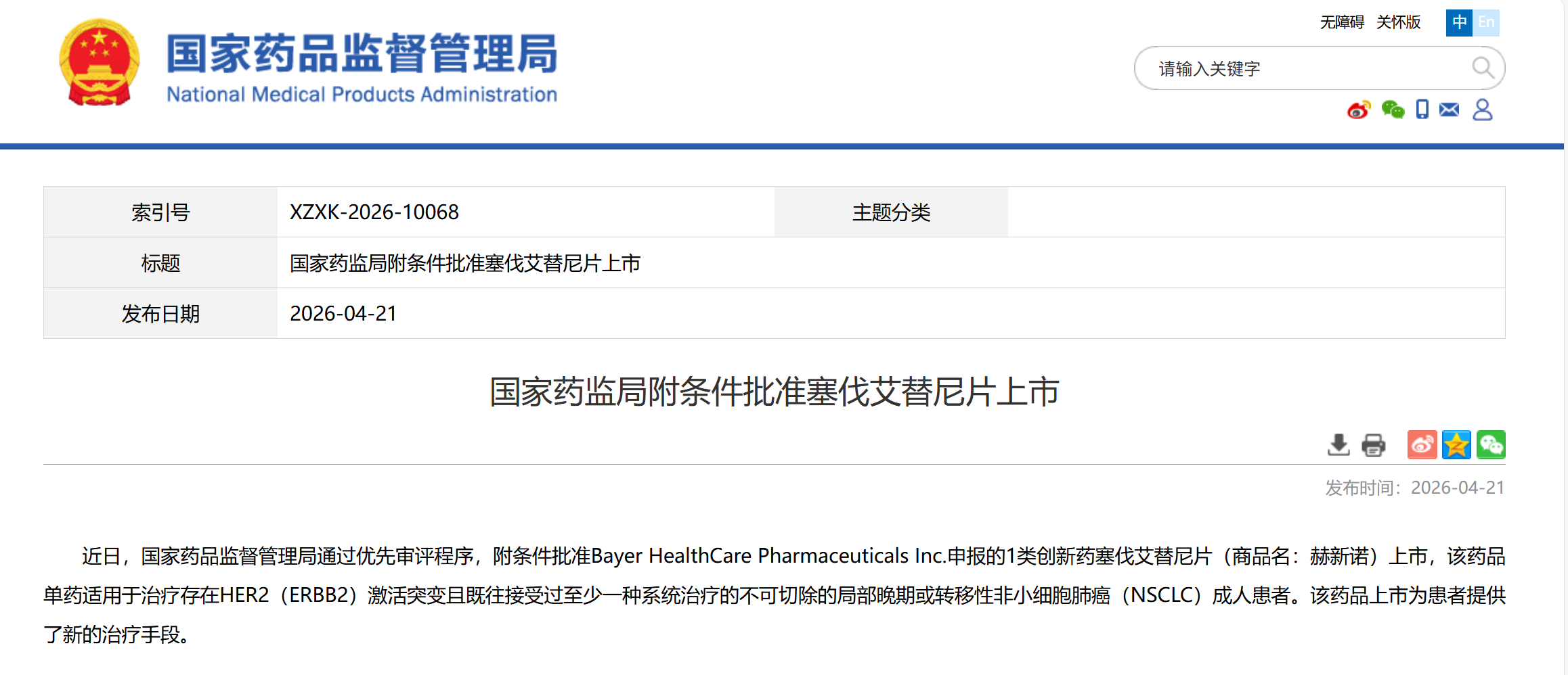 转自:国家药监局 编辑:水晶4月21日,据国家药监局网站消息,近日,据国家药监局通过优先审评程序,附条件批准Bayer HealthCare Pharmaceuticals Inc.申报的1类创新药塞伐艾替尼片(商品名:赫新诺)上市。该药品单药适用于治疗存在HER2(ERBB2)激活突变且既往接受过至少一种系统治疗的不可切除的局部晚期或转移性非小细胞肺癌(NSCLC)成人患者。