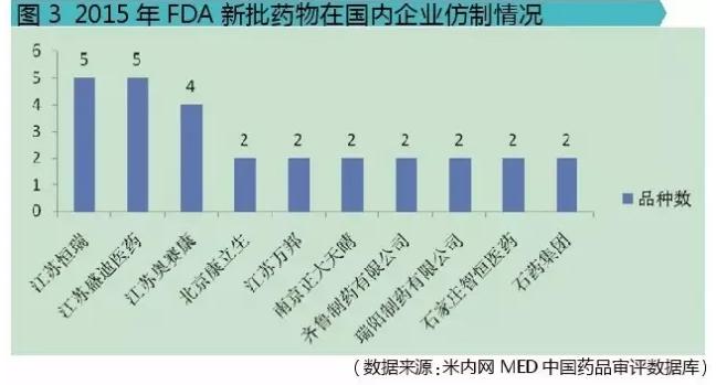 经过对这9个新药的相关审评信息分析,可以看出国内企业的研发实力。江苏恒瑞医药股份有限公司、江苏盛迪医药有限公司、江苏奥赛康药业股份有限公司3家公司的仿制品种数排在前列,分别是5个、5个和4个。此外,北京康立生、江苏万邦、南京正大天晴、齐鲁制药、瑞阳制药、石家庄智恒医药、石药集团均有2个仿制品种,其余30家国内企业均各有1个仿制品种(不纳入图表中分析)。虽然这只是特指对2015年FDA新批药物的仿制,只是比较小的一个层面,但也能间接看出排在前三公司的研发实力。