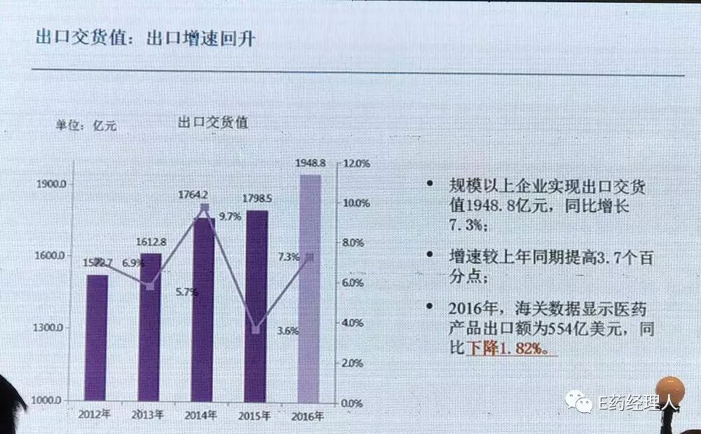 2016年全国规模以上医药工业增加值增速是10.6%,较2015年提高0.8%,位列全国工业第二,且高于全国增加值4.6%的增速。但根据海关数据反应,2016年整个医药产品出口额出现负增长,这是金融危机都没有出现的情况。但其中亮点是:对欧美制剂出口分别达4.36亿美元和2.95亿美元,对美市场制剂出口增长超过40%。