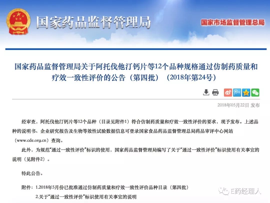 5月22日,国家药品监督管理局发布《关于阿托伐他汀钙片等12个品种规格通过仿制药质量和疗效一致性评价的公告(第四批)》,宣布包括阿托伐他汀钙片在内的八个品种共12个规格通过一致性评价。其中涉及浙江华海、正大天晴、上海迪赛诺生物、浙江京新、北京嘉林、江西青峰、湖南洞庭药业、石药欧意、江苏豪森等9家公司。