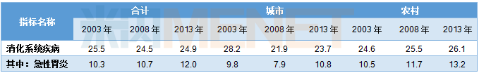 《2017年中国卫生和计划生育统计年鉴》显示,急性胃炎的患病率由2003年的10.3‰上升至2013年的12.0‰,随着患病率的上升,胃肠道用药规模也加速扩大。