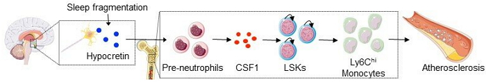 缺少睡眠会导致hypocretin水平降低,进而导致骨髓中一系列验证变化(免疫细胞产生过多),伴随着时间的累积最终破坏血管并引发动脉粥样硬化的发生。(图片来源:Filip Swirski)
