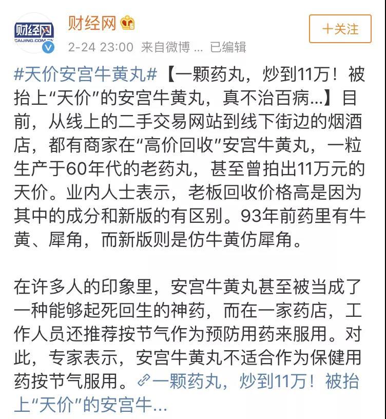 前两天,微博上一条“天价安宫牛黄丸”的新闻,引起了大家的关注。这种 3 克一颗的药丸,在民间据说有着“起死回生”的救命神药之称,甚至卖出了 11 万一颗的天价。