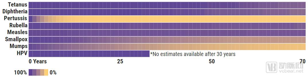 图:针对不同疫苗的疫苗表现出不同的耐久性,从上往下依次是破伤风、白喉、百日咳、风疹、麻疹、天花、腮腺炎、HPV