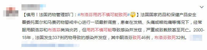2.法国药管部门的调查显示,18年间共发现了337例与布洛芬相关的感染并发症,其中致死32例,但并没有给出布洛芬直接导致感染并发症或致死的结论。所以,目前还不能得出“布洛芬用药不当可能致死”的结论。