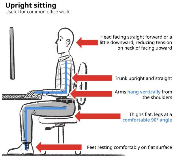 除非我们的前臂支撑在工作桌面上,同样重要的是,手臂垂直地从肩膀垂下,肘部靠在驱赶上,将没有支撑的手臂向前举起,这时候需要肩膀和脖子之间的肌肉发挥作用,而这通常会导致肌肉疲劳和不适。在这种坐姿下,头部应该直视前方或稍微向下看,而向上看会增加机体颈部的紧张感,或会引发不适感觉。
