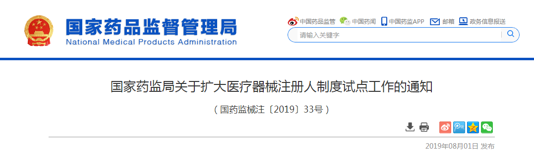 为深入贯彻落实中共中央办公厅、国务院办公厅《关于深化审评审批制度改革鼓励药品医疗器械创新的意见》(厅字〔2017〕42号)精神,加快推进医疗器械产业创新发展,在前期上海、广东、天津自贸区开展医疗器械注册人制度试点工作的基础上,今日,国家药品监督管理局(以下简称国家局)发布《关于扩大医疗器械注册人制度试点工作的通知》(国药监械注〔2019〕33号,以下简称《通知》),进一步扩大医疗器械注册人制度试点,为全面实施医疗器械注册人制度进一步积累经验。
