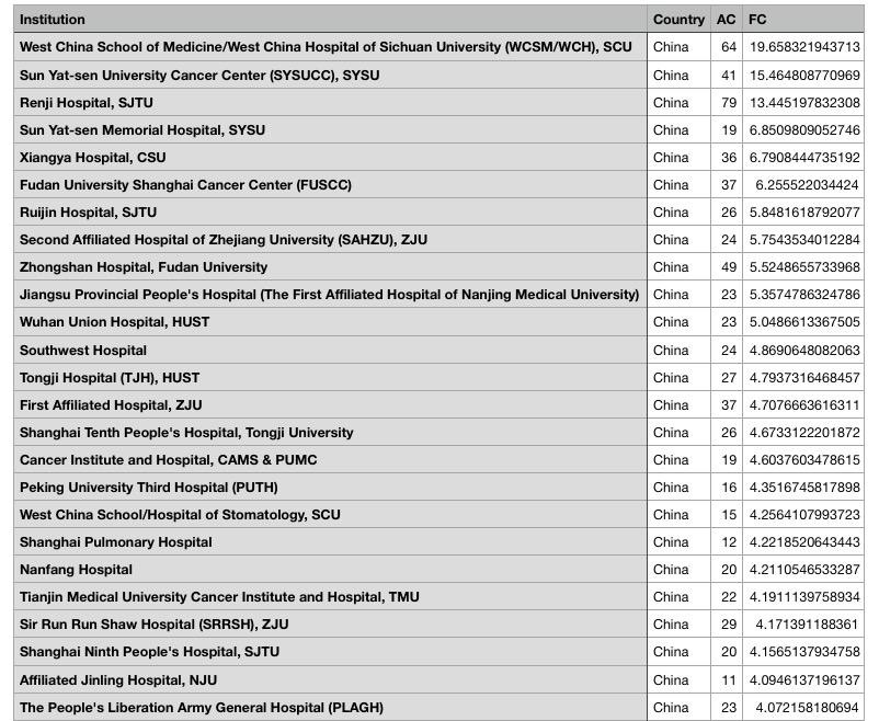 排名表格中,论文计数(AC)指不论一篇文章有一个还是多个作者,每位作者所在的国家或机构都获得1个AC分值;分数式计量(FC)则考虑了每位论文作者的相对贡献。