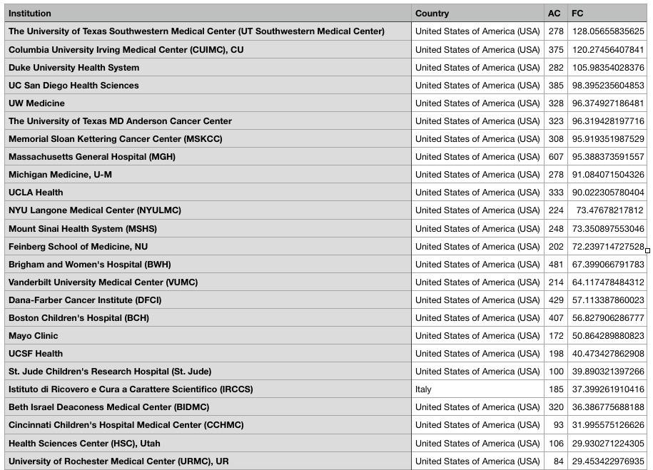 上述排名与中国医学科学院医学信息研究所发布的“中国医院科技量值评价”排名有不小的差距。2018年中国医院科技量值评价榜单前三名分别是华西医院、中国人民解放军总医院及北京协和医院,在“自然指数”中,华西医院仍排第一,中国人民解放军总医院排在第25位,而北京协和医院甚至没有进前25,而是以AC=12,FC=1.77的成绩排在了第56位。排名的变化,与评价体系的不同有关。