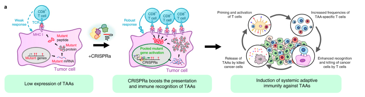 利用CRISPRa增强TAAs的免疫识别,引发全身免疫反应的实验设计示意图