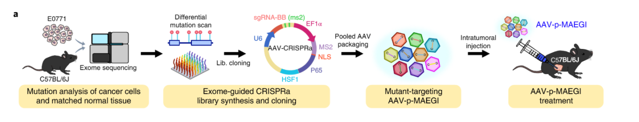 在这里,研究人员进行了一项三阴乳腺癌小鼠模型试验。他们首先通过全外显子测序找出癌细胞系的所有基因突变;接着设计了靶向肿瘤而不靶向正常细胞的精准激活库(p-MAEGI CRISPRa library);最后以瘤内注射广泛应用于基因治疗临床于研究中的腺相关病毒(AAV)来完成药物投递。