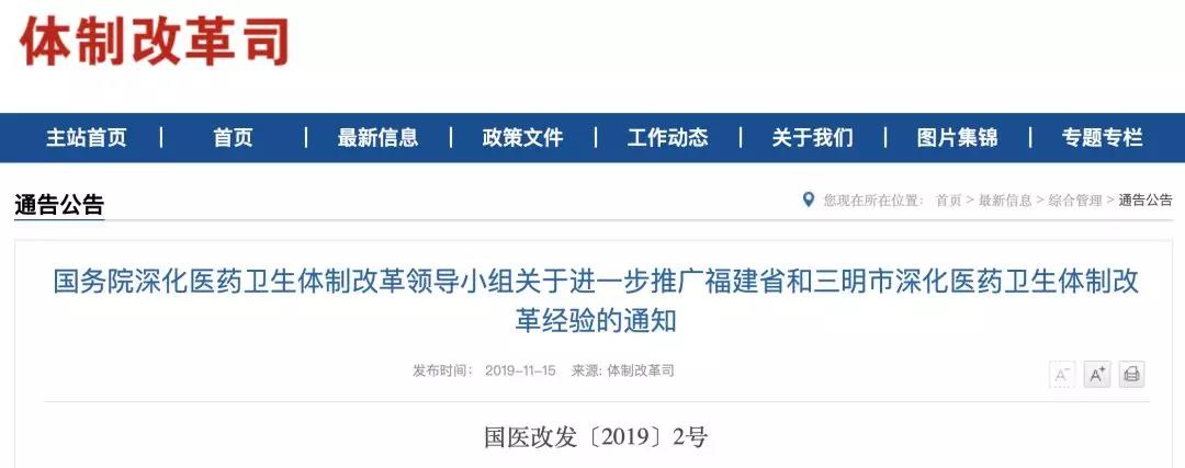 11月15日,国务院深化医药卫生体制改革领导小组下发《关于进一步推广福建省和三明市深化医药卫生体制改革经验的通知》(以下简称“通知”)释放重大信号。