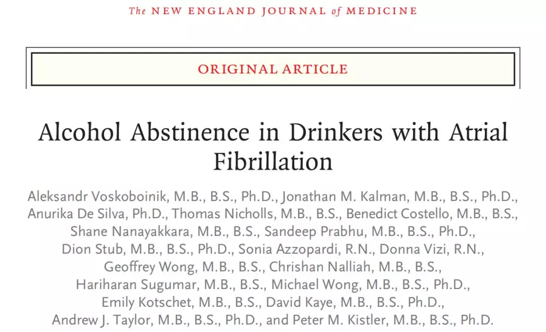 2020年1月2日,四大医学期刊之首的《新英格兰医学杂志》(NEJM)发表了一篇题为:Alcohol Abstinence in Drinkers with Atrial Fibrillation 的研究论文。论文指出戒酒可有效减少常饮酒且患心房颤动者心律失常的复发。