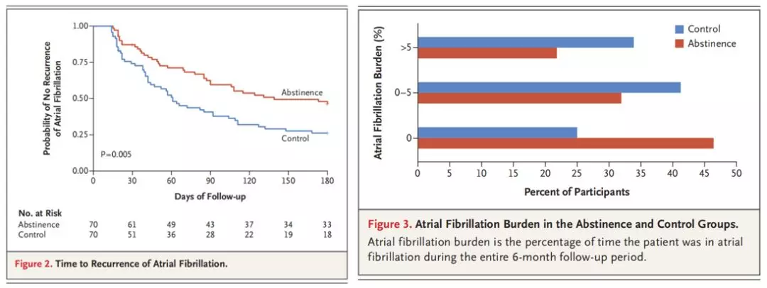 两周后,统计房颤复发人数,戒酒组中37例(53%),对照组为51例(73%)。并且,戒酒组相比于对照组房颤复发前的时间更长。此外,戒酒组6个月以上的房颤负荷明显低于对照组。