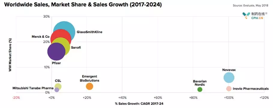 目前,Evaluate pharma 统计数显示,2017年全球疫苗市场规模接近300亿美金,其中GSK,默沙东赛诺菲和辉瑞是疫苗市场中的“四大天王”,四者累积市场份额高达90.1%。
