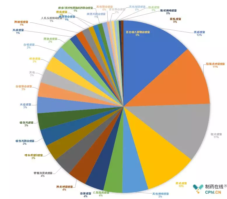 笔者根据公开资料整理获得,目前,中国已获批上市的疫苗总计63个品种,其中,流感疫苗占13%,其次是脑膜炎球菌疫苗11%,狂犬疫苗11%,肝炎疫苗10%。