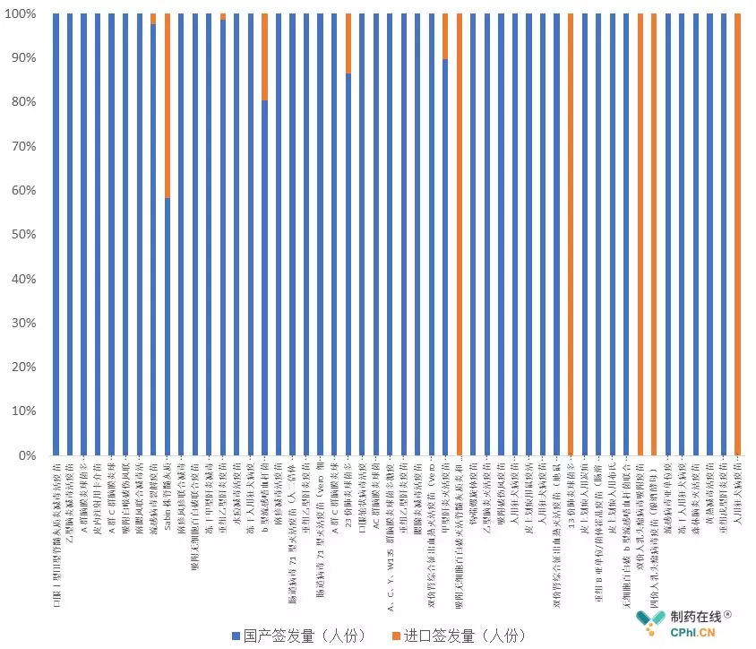 《2017 年生物制品批签发年报》显示,口服Ⅰ型Ⅲ型脊髓灰质炎减毒活疫苗(人二倍体细胞)2017年批签发量最大,总计162083400人份。1. 总的来看,国产疫苗占上市疫苗主体,占比90%以上;然而,某些品种国内依旧没有生产能力,全靠进口,如吸附无细胞百白破灭活脊髓灰质炎和b型流感嗜血杆菌(结合)联合疫苗、13 价肺炎球菌多糖结合疫苗、双价人乳头瘤病毒吸附疫苗、四价人乳头瘤病毒疫苗(酿酒酵母)等。