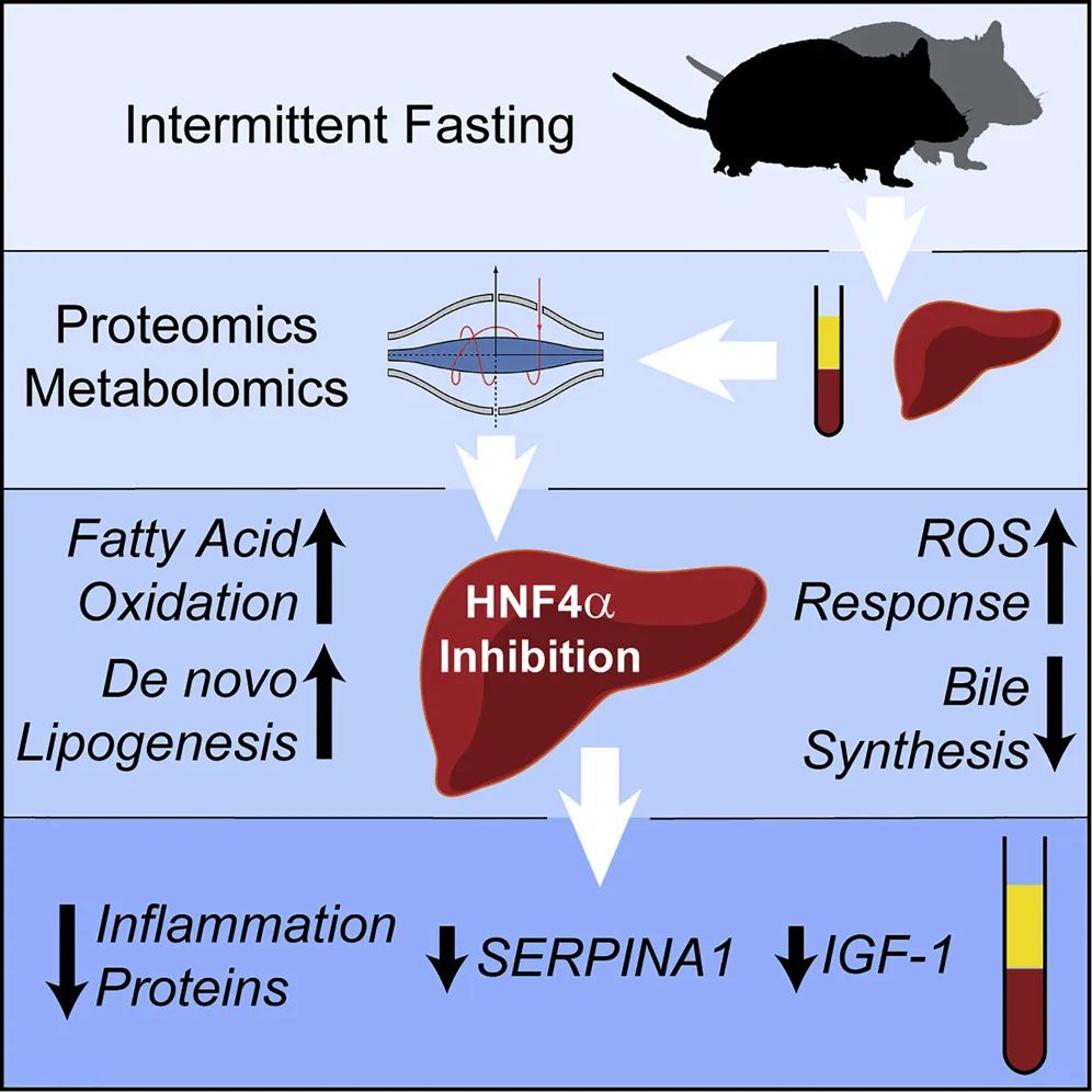 此外,分析结果也让科学家们 发现了不少过去不知道在间歇性禁食中起作用的蛋白,比如HNF4α。作为一种转录因子,这种蛋白调节了肝脏中大量基因的表达。而这项研究意外地发现,隔日禁食会抑制HNF4α的作用,从而影响其他下游基因,比如负责胆汁合成的酶,或是一些炎症因子的分泌。