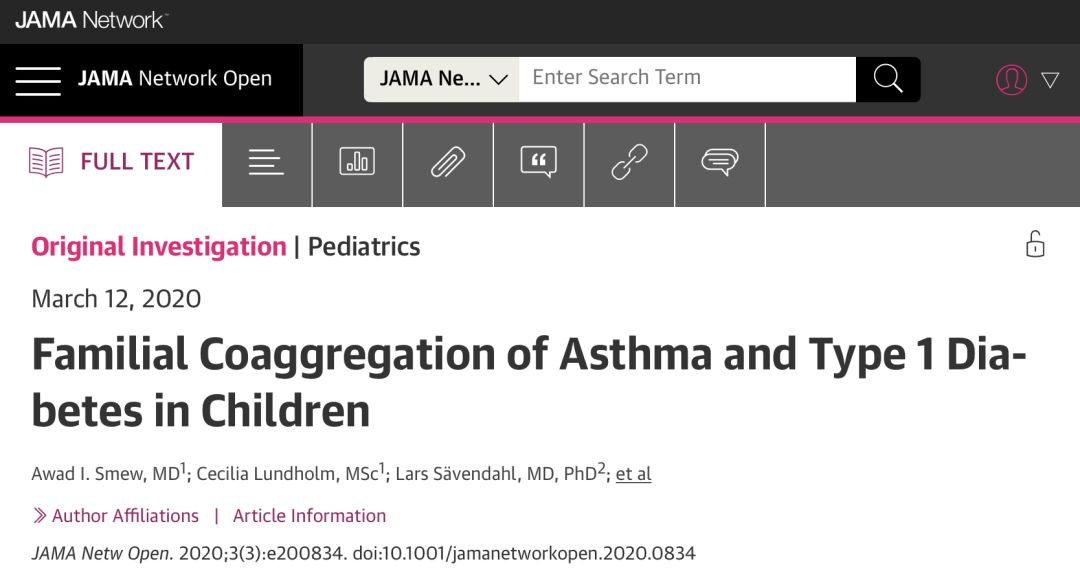 近日,瑞典卡罗林斯卡医学院的Awad I. Smew团队在JAMA Network Open上发表重要结果,依据128万多名儿童的哮喘和1型糖尿病发病情况的大数据统计,证实儿童中两种疾病存在并发、相继发生和家族性聚集现象,对临床实践具有重要的参考价值。