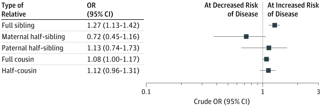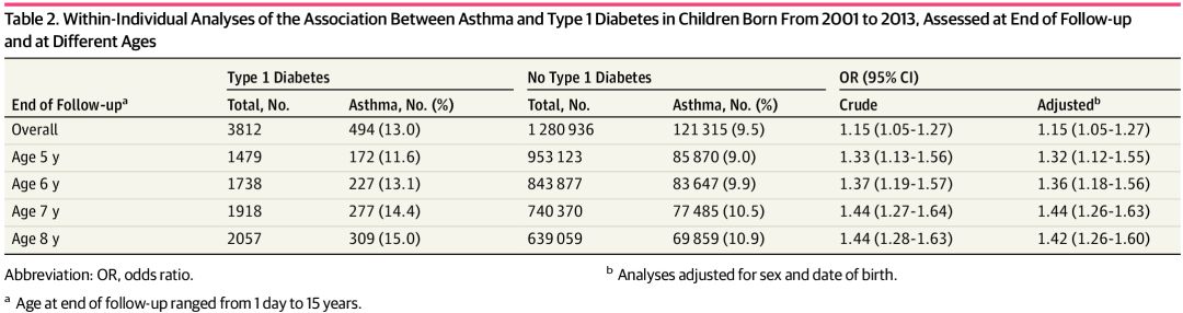进一步,研究者调查两种疾病发生的先后关系,发现哮喘儿童的平均确诊年龄为3.0岁,而1型糖尿病儿童平均确诊年龄为5.9岁,说明1型糖尿病发病通常晚于哮喘;与先前的研究结果一致,研究者发现哮喘确诊的儿童1型糖尿病风险更高(1.16:1),但1型糖尿病确诊儿童哮喘风险并无显著升高(0.92:1)。