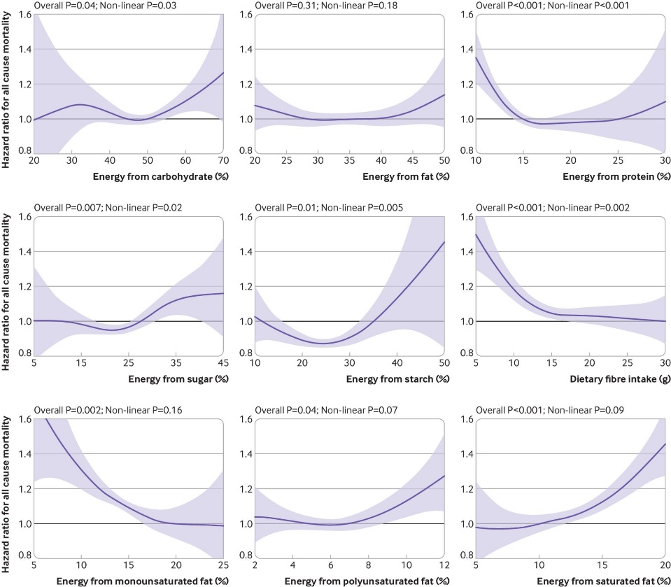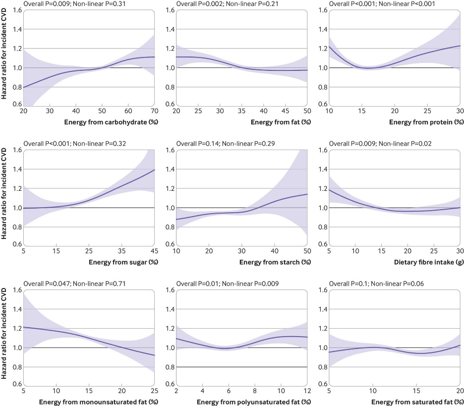 通过对这些参与者的数据进行分析,研究人员发现碳水化合物(糖、淀粉和纤维)和蛋白质的摄入与全因死亡率呈非线性关系,而脂肪则与全因死亡率呈线性相关。其中,较高的糖分摄入与全因死亡风险和患心血管疾病的风险较高均有关联,而较高的饱和脂肪酸摄入与全因死亡风险较高有关。