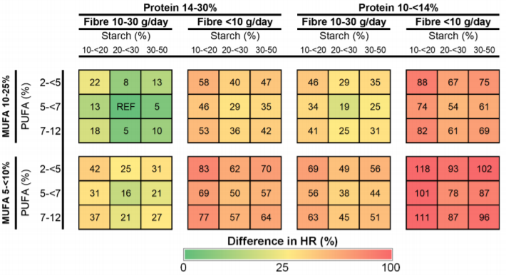 进一步研究表明,在所有的饮食模式中,全因死亡率风险最低的饮食方式为:10-30g高纤维、14-30%蛋白质、10-25%单不饱和脂肪酸、5%-7%多不饱和脂肪酸以及20%-30%淀粉摄入。