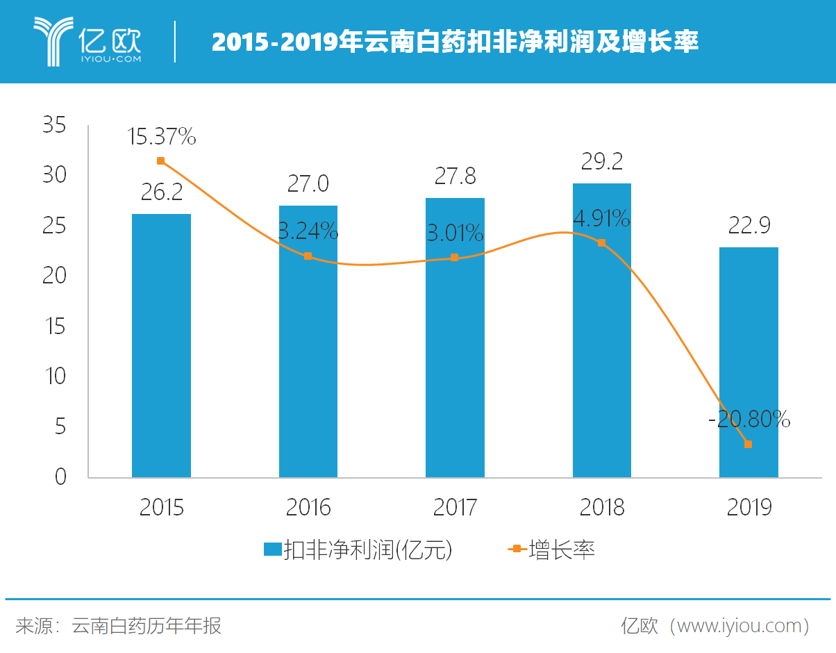 [ 亿欧导读 ]2019年,云南白药扣非净利润下滑两成,这也是近20年以来其扣非净利润首次出现负增长。
