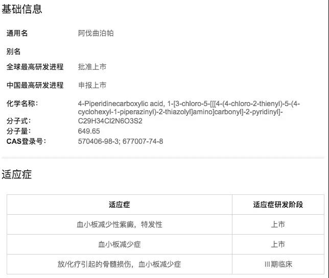 2018 年 5 月,AkaRx 阿伐曲泊帕片(Doptelet)适用于择期行诊断性操作或者手术的慢性肝病相关血小板减少症的成年患者获FDA上市批准。