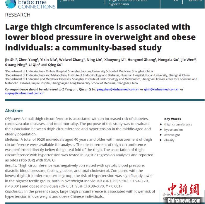 新华医院21日披露,该院内分泌科苏青教授和杨震教授课题组在一项基于近万人的社区流行病学调查中发现,与拥有细的大腿人群相比,在超重和肥胖人群中,拥有粗壮大腿者患高血压的风险反而下降,分别降低了近30%和50%。
