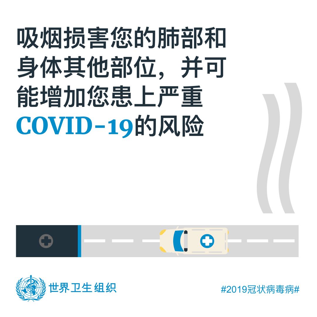 2019冠状病毒病是一种主要侵袭肺部的传染病。吸烟造成肺功能损害,使人体更难抵抗冠状病毒和其他疾病。烟草还是心血管疾病、癌症、呼吸系统疾病和糖尿病等非传染性疾病的主要风险因素,当受到2019冠状病毒病影响时,已存在这类疾病的人罹患重病的风险更高。现有研究表明,吸烟者发展为重症和出现死亡的风险更高。