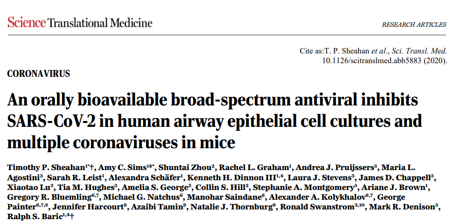 Ridgebeck Bio公司开发的EIDD-2801是一款口服RNA依赖性RNA聚合酶(RdRP)抑制剂。这款在研疗法由埃默里大学(Emory University)的研究团队开发,最初用于治疗流感。然而研究发现,它具有对多种病毒的“广谱“抑制活性,其中也包括了新冠病毒。日前,埃默里大学的研究团队在Science Translational Medicine杂志上发表论文,描述了这一在研药物在临床前研究中抑制多种冠状病毒的活性。值得一提的是,它能够对已经对瑞德西韦产生抗性的冠状病毒起作用。